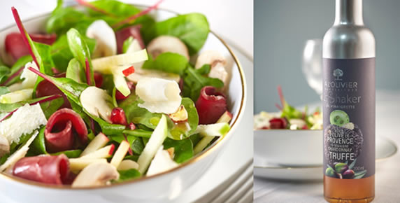 Salade de magrets fumés, pommes et vinaigrette truffe