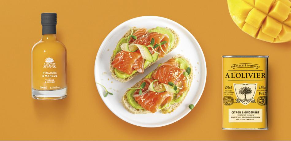 Tartines de saumon fumé et avocat à l'huile d'olive aromatique citron & gingembre et au vinaigre de mangue A l'Olivier